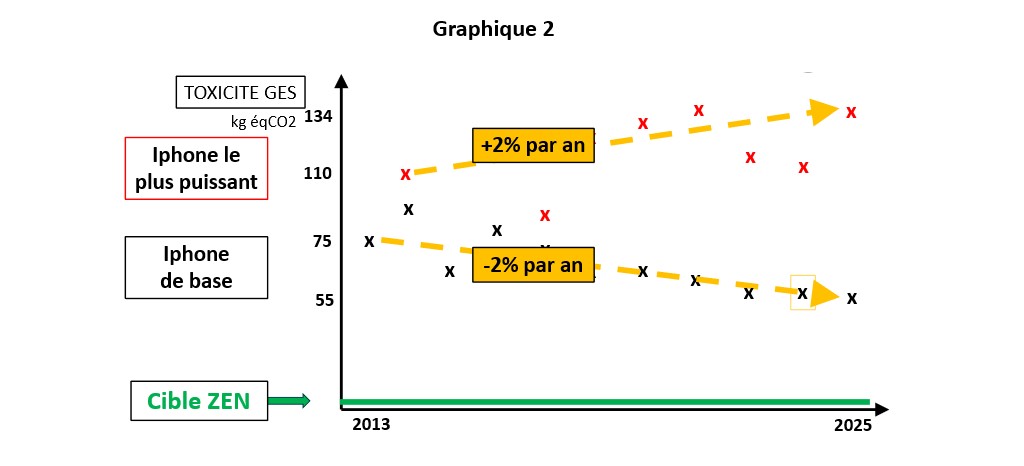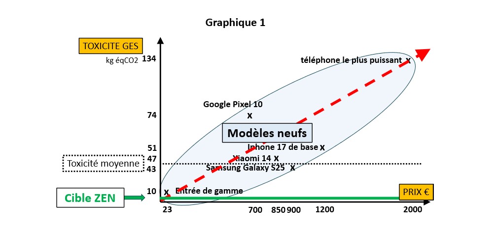 La concurrence ZEN permet de classer les appareils à la fois selon leur prix et leur contenu en émission nette, c’est-à-dire leur toxicité en GES. La cible ZEN, pour ce besoin comme pour les autres, est de rendre négligeable la toxicité GES moyenne d’un téléphone neuf.