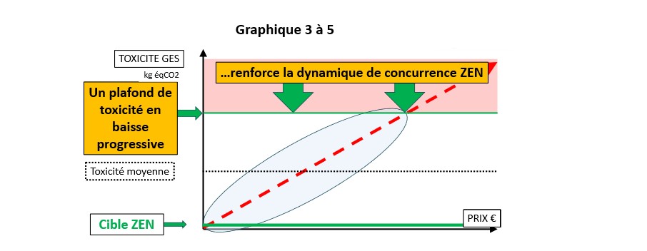 Le mécanisme est décrit sur les graphiques 3 à 5. Il suppose un plafond de toxicité par appareil qui n’est pas conçu pour être contraignant au départ (supérieur par exemple à la performance de 95% des appareils vendus). Ce plafond est annoncé en baisse régulière de façon à équilibrer les priorités d’innovation des leaders : moins sur les fonctionnalités supplémentaires toxiques, plus sur les innovations ZEN. La communication de la trajectoire du plafond enclenchera une dynamique de règles et de concurrence ZEN, utilisant la panoplie des moyens qu’un pays a de limiter la vente de produits dangereux pour la population.