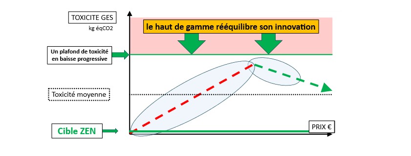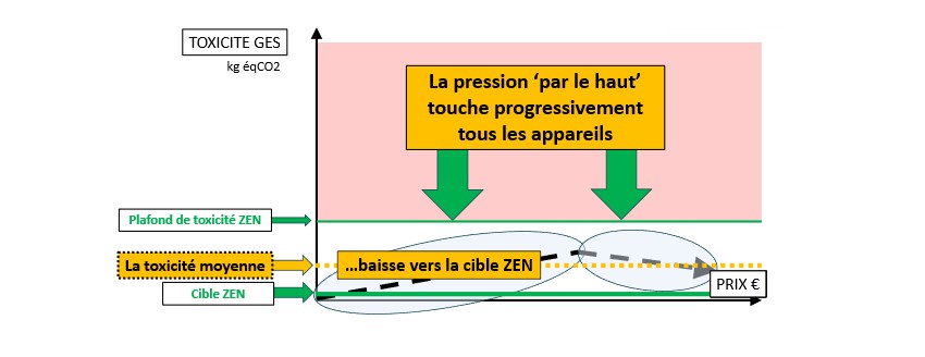 Seul le haut de gamme bouge au départ, mais la pression ‘par le haut’ s’applique progressivement à tous les appareils. Les innovations ZEN des leaders sont copiées. Une dynamique ZEN s’enclenche qui baisse la moyenne de toxicité par appareil, l’objectif collectif.